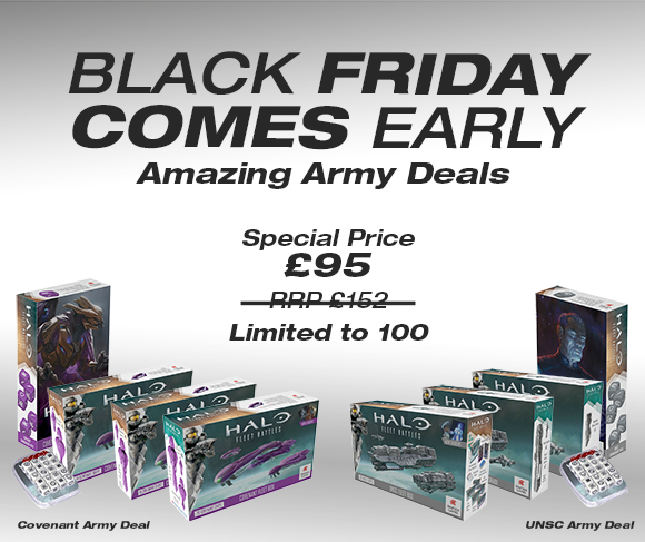 | | Halo: Fleet Battles Army Deals | | | | Available to buy separately this weekend only. | Halo: Fleet Battles is the newest product to join the ranks of games from Spartan Games and not wanting to let you miss out on some explosive deals, we've let the game creators come up with a deal that any would-be UNSC or Covenant commander will love. We've taken a Fleet Box, Commander Box, Core Upgrade Box, Heavy Upgrade Box and Dice blister and rolled it into a truly amazing £95 bundle. And if that's not enough, we'll also include in your order a £10 voucher you can redeem against a Carrier Box of your choice! This ultimate bundle is limited to the first 100 lucky Fleet Commanders!