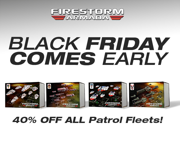 | | 40% OFF Firestorm Armada Patrol Fleets With Firestorm Armada we're using the same discount, but this time it applies to every Patrol Fleet we make for our exciting space combat game. The ideal way to either start playing, expand your existing fleets or add a new Kurak or Zenian faction.