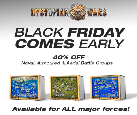 | |  |  | | 40% OFF Dystopian Wars Battle Groups Let's take a look at Dystopian Wars where we've taken every Naval, Armoured and Aerial Battle Group for our core seven nations and hacked a whopping 40% OFF each box. So if you've been thinking about starting a new faction, or just want more cool models to use in your games this deal is perfect for you.
